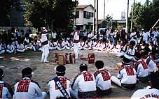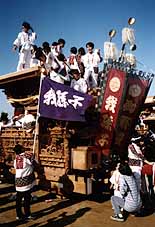 休憩中は、車座になって一気飲み大会 大暴れで、町内を練り歩いたあと、穴師公園で地車を止めて休憩、曳き手の青年団は車座になって一気飲み大会。 祭には、酒! こんなに飲んで、走り回ったら相当酒に強い人でも倒れるだろうと下戸の私はよけいな心配。 止めてある地車には、子供会の連中が、屋根にのぼってあこがれの大工方の練習をしていました。