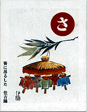 笹に吊した 住吉踊 住吉踊は住吉大社に古くから伝わる舞で、五穀豊穣・ 天下泰平などを祈ります。踊手の服装は僧服から出ており、 色の五彩は天地五行、傘は仏法の天蓋、踊りの手振りも 四人合わせて心の字の形に踊ります。 この踊る姿・形を麦藁人形にし笹につるしたもので、 住吉伝統民芸品の1つとして今に至っています。 |