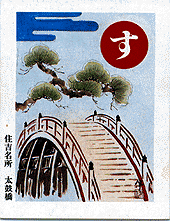住吉名所 太鼓橋 反橋(そりはし)ともいわれ、住吉大社社殿正面の 池にかかっています。朱塗りの半円形の欄干が美しく、 住吉の代表的な名所となっています。慶長年間淀君の 奉納架替したものといわれ、境内には川端康成の 「反橋は上がるよりも、おりる方がこはいものです。 私は母に抱かれておりました」という文学顕彰碑が立っています。 |