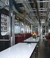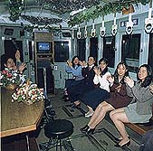 | Type ONE ●懐かしの大阪市電を改装した 専用電車 ●シンセサイザーカラオケ完備 ●カウンター席もあるバラエティ シート ●ご利用人数20〜28人 |