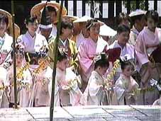 植女は、旧社領の堺乳守(ちもり)に落ちついて代々奉仕したそうです。 植女は後に乳守の遊女になったので、遊女たちも実際には田にも入った そうですが、いつの時からか替植女に苗を渡して代わりに植えてもらいました。 明治維新以降は新町廓の芸妓が奉仕することになりました。