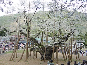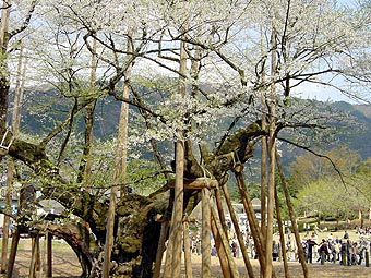現在、樹高17.2m、枝張り東西23.9m、南北21.2m、幹囲り9.1mあり、花の盛りは4月上旬である。