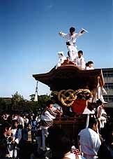 休憩中は、車座になって一気飲み大会 大暴れで、町内を練り歩いたあと、穴師公園で地車を止めて休憩、曳き手の青年団は車座になって一気飲み大会。 祭には、酒! こんなに飲んで、走り回ったら相当酒に強い人でも倒れるだろうと下戸の私はよけいな心配。 止めてある地車には、子供会の連中が、屋根にのぼってあこがれの大工方の練習をしていました。