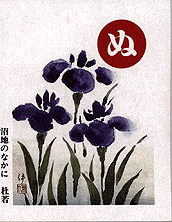 沼地のなかに 杜若 太古の浅沢は広大な入江でしたが、時の流れとともに 段々と縮小され、沼地となりました。浅沢は、 万葉集に「住吉の浅沢小野の杜若、衣に摺りつけ、 着む日知らすも」と詠まれた杜若の名所でありましたが、 今ではその面影はありません。 |