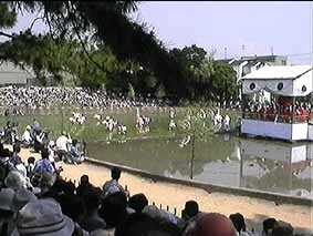 神水による御祓いのあと、植女から替植女に早苗が渡され、田植えが始まります。 田植えが行われている間、神田の中央の舞台や周囲で舞や踊りなどの行事が行われ、 これらの行事が終わった頃に田植えが終わっています。